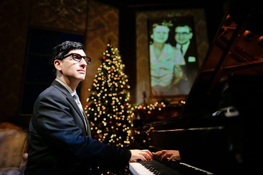 One challenge for Felder is that his subject was neither a gifted singer or piano player – and so he approached the music he’d play in more of an idealized way, as Berlin might have heard it in his head: “I had to figure out a way to make these things feel very virtuosic without yet showing anybody that they are. The fingers are going, but at the same time it’s not too showy… Part of the fun of this show is how do you create a character – especially if you’re a musician and you want to play music – that doesn’t really sing and doesn’t really play, but really sings and really plays.” Berlin could only play songs in one key on the piano, and so he got an instrument that could transpose by shifting the physical keys right or left to play different strings. The framing device of the show centers around an event from late in Berlin’s life: “Carolers gathered in front of his house, and they would sing to him every Christmas Eve. And most of the time he would shut the blinds, but one year he invited them in and he talked to them.” The set, complete with Christmas tree, is dressed to be like Berlin’s Beekman Place apartment. Even before he had written White Christmas, which would be the best-selling single record of all time sung by Bing Crosby, he was already internationally known for his Alexander’s Ragtime Band.