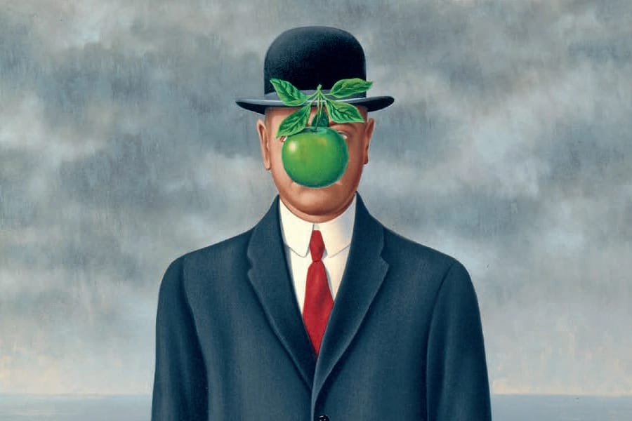 Among the highlights is the immersive gallery in which there are many iterations of his painting The Dominion of Light. It shows an outdoor scene with paradoxical lighting. “The lower portions feel like night, and the upper portions feel like day,” curator Caitlin Haskell says. “And the way that the compositions are created, it allowed us to sort of join their horizon lines, so that these street lamps are all on a level, and you can sort of walk into that space and inhabit it, in a way that no one has been able to before.” That’s because although he painted more than 20 versions of the theme, they haven’t been shown together with more than 2 until now. (He was painting one for a museum that he decided to submit to the Venice Biennale without alerting the museum… so he had to paint another, and then Peggy Guggenheim wanted one, so he had to paint another.) “The paintings stand together as sort of a discrete subset or series within Magritte’s corpus, because they all have the same title. But in Magritte’s lifetime, he did not show them together. We’re able to see The Dominion of Light as a series for the first time.” There are also many of the ‘hypertrophic’ pieces, with a gigantic apple or flower crowding a small room, or SFMOMA’s Personal Values, which has an outsized comb, shaving brush, matchstick, soap, and goblet in an otherwise normally sized bedroom. And men wearing bowlers, or their silhouettes appear in several guises. Haskell says they’re summed up by his best known example, The Son of Man. “Maybe the most beguiling self-portrait of the 20th Century. So we’re really really lucky to be able to include one of Magritte’s most iconic paintings. What I love about this work is that it just sets your mind questioning. You think you know who this very bourgeois man is in the bowler hat, and yet because of the placement of the apple, you’re constantly wondering what is behind there. You think you know, but do you know?”