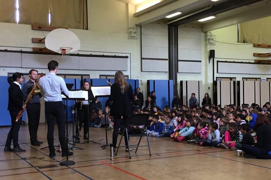 At Ocean View Elementary School in Albany last month, a gym full of students had a chance to hear a woodwind quintet made up of players from the larger ensemble One Found Sound. It was part of KDFC’s Playground Pop-Up series (although a threat of rain brought the music inside), which brings informal performances to where the kids are.