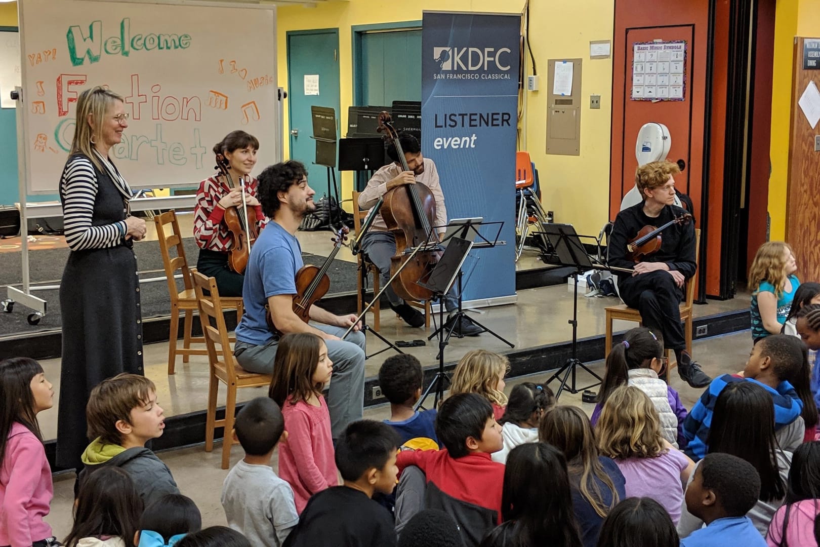 Several hundred 3rd, 4th and 5th graders packed Oakland’s Cleveland Elementary School cafeteria this afternoon to hear something many of them had never heard before: a live concert by a nationally renowned string quartet. Under the auspices of a recently launched station initiative called KDFC Playground Pop-Ups, the renowned Friction Quartet played a wide range of classical and contemporary repertoire, bringing down the house with its grand finale: a string arrangement of the Star Wars theme by John Williams. The theme of the concert linked music to such natural wonders as the layers of rock at the Grand Canyon and the flow of rivers into oceans. The kids were captivated. Later they cheered on their teachers as the teachers joined Friction violinist Kevin Rogers in a raucous game of “Soundball”.