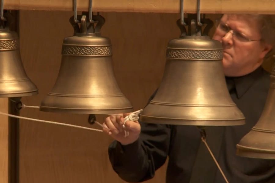 Victor Avdienko says rather than picking up these bells, they’re mounted in place. “The difference with Russian bells is that the bells are fixed, and the clappers are all attached to a rope. So traditionally, you’d have up to 13 bells in a tower, and you can have all those ropes come to one person, and I’ll manipulate the ropes with either foot pedals or both hands.” The bells in church towers can be thousands of pounds, but this collection, a set of six on a stand, plus two flat bells or ‘bila’ that enable these concerts to take place away from the orthodox churches that have the bigger instruments. “The primary function of Russian bells is not melody, it’s rhythm,” Avdienko says. “So, it’s very similar to gamelan music, where the larger bells will be playing at a much slower rate, and then as they get smaller, the smallest ones play the real rhythmic interest in Russian bells.” Saturday’s concert will include both traditional peals, as well as improvisations. “It’s a relatively new thing now, especially in the United States. When I grew up, I grew up here in San Francisco, I’m a Russian Orthodox. I never knew about all these things. And as a percussionist, when I saw how it’s played, it’s like, OK, well that’s a new percussion instrument for me right now. It’s like a drum set. I can play all the ropes and all the feet, and it was pretty easy for me to figure out.” Avdienko’s association with Blagovest Bells began when he was performing a work by Shostakovich with the San Francisco Symphony, and needed to find a set of bells. “All roads pointed to Mark [Galperin], because he’s a real campanologist. He knows everything about bells from a physical aspect, because he was a physicist, and also all the spiritual aspects.”